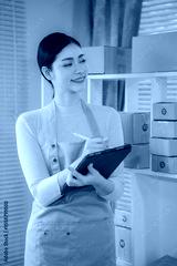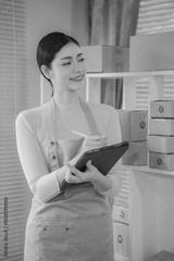 Asian woman delivery concept, freelance, online shopping, working on laptop with parcel box at home, online SME business, vertical photo.