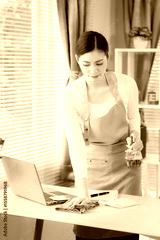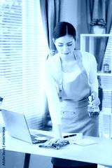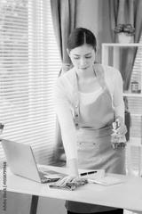 Asian woman cleaning bright room, professional house cleaning service concept, service, worker dusting in living room at home, vertical photo