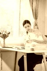 A woman is working with documents on her desk and files. Organizing documents, reviewing financial information. She is reviewing important documents while holding a stack of documents on her desk.