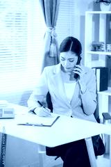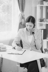 Asian businessman working on laptop and talking on phone while sitting at desk with charts and graphs showing productive work day, vertical illustration