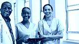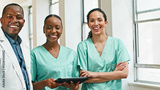 Multicultural Medical Team Smiling in Hospital Room Featuring Diverse Healthcare Professionals