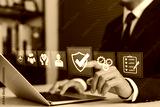 Work Safety and Compliance Concept. Businessman using laptop with icons safety, compliance, quality control, and risk management, representing workplace safety, regulations, and operational standards.
