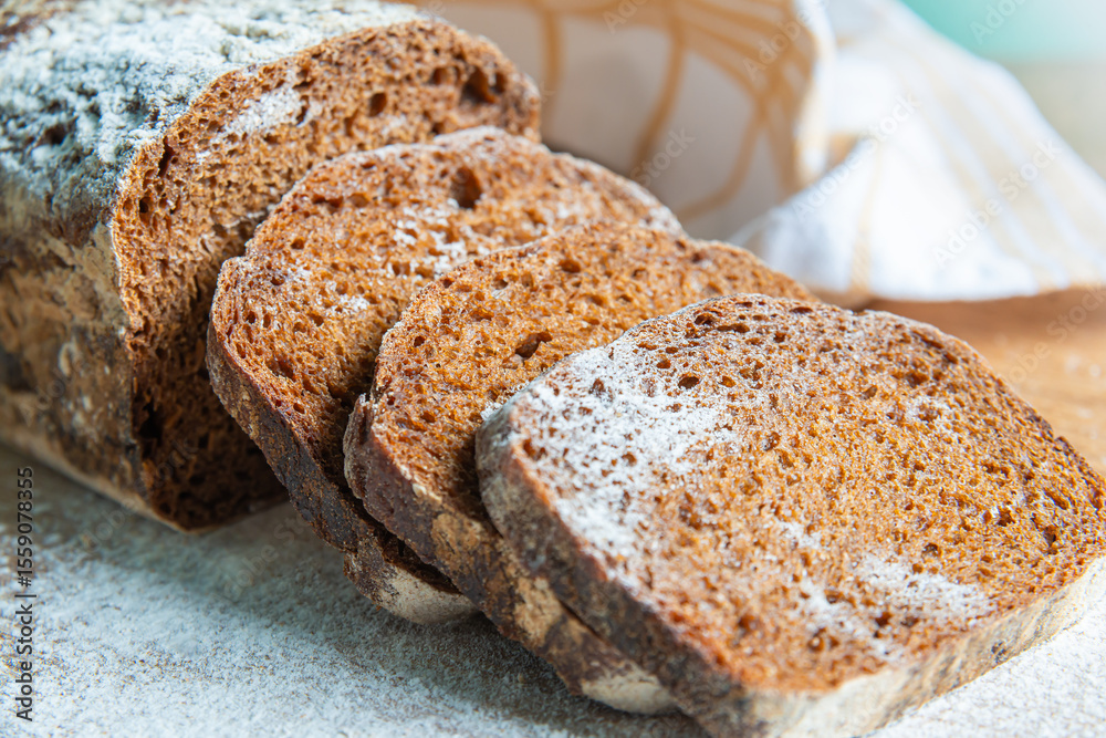 Freshly baked rye bread with sliced pieces displayed on a wooden surface in a cozy kitchen setting