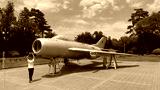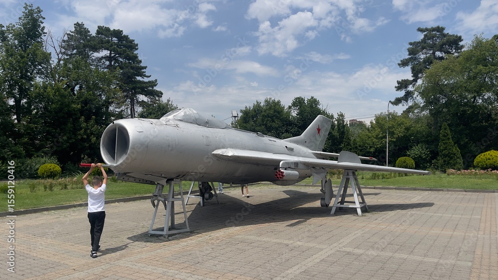 Vintage Soviet Fighter Jet on Outdoor Display with Child Observing