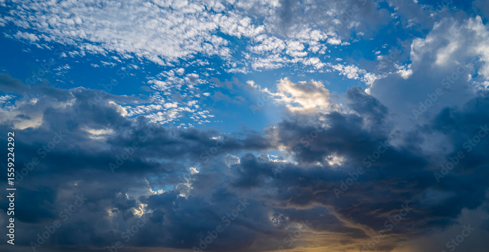 Sky on sunset. Beauty sunrise with sunlight background. Twilight, dramatic dawn, dusk, sunshine. Cloudy sunset. Sunset wallpaper. Sky sunset overlay. Peaceful horizon. Panorama of glow shiny sky.