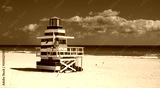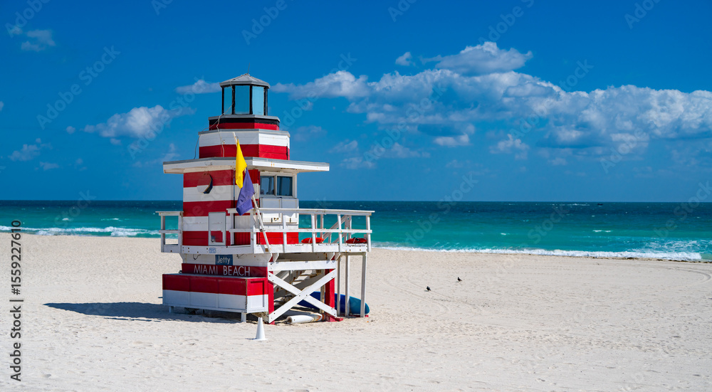 Miami Beach lifeguard at the summer beach. South Miami Beach with lifeguard. Sky above lifeguard tower in Miami. Iconic lifeguard tower on sand in Miami. A symbol of Miamis coast.