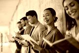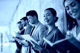 Happy Korean businesswoman using digital ablet while waiting for job interview and looking at camera.