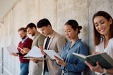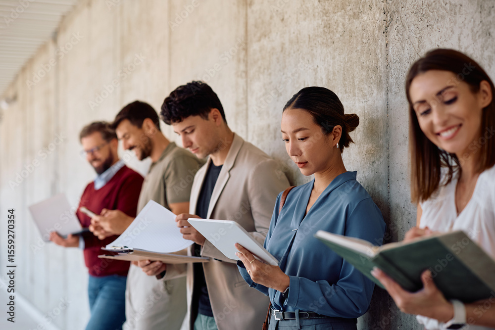 Korean businesswoman using touchpad while waiting for a job interview with other candidates.