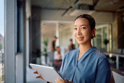 Smiling Korean female entrepreneur working on touchpad in the office and looking at camera.