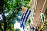 Uruguayan flag waving with green trees in the background at the Uruguayan embassy in Mexico