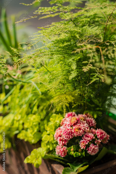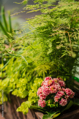 Lush green plants surround a bouquet of pink flowers, infusing the atmosphere with natural beauty