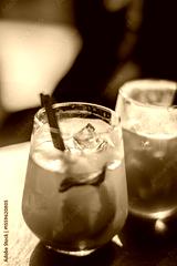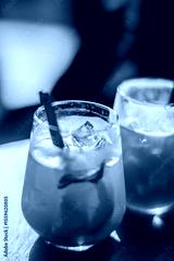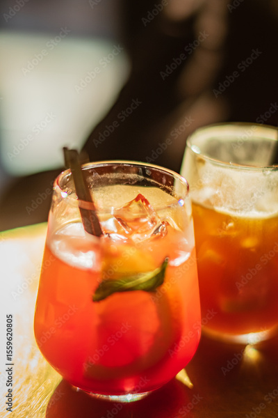 Refreshing cocktails in vibrant colors are served at a wooden table, capturing the evening's charm