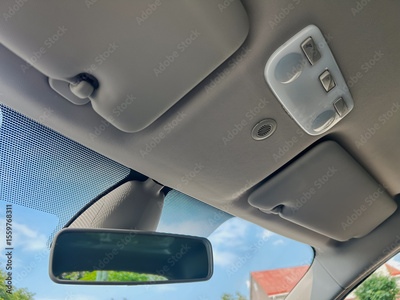 This image depicts the interior view of a car roof, showcasing the rearview mirror alongside the sun visors. These features enhance the experience of driving, commuting, and traveling in automobiles