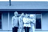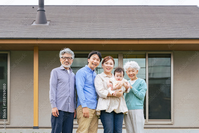 住宅の前で赤ちゃんを笑顔で囲む三世代家族の集合写真
