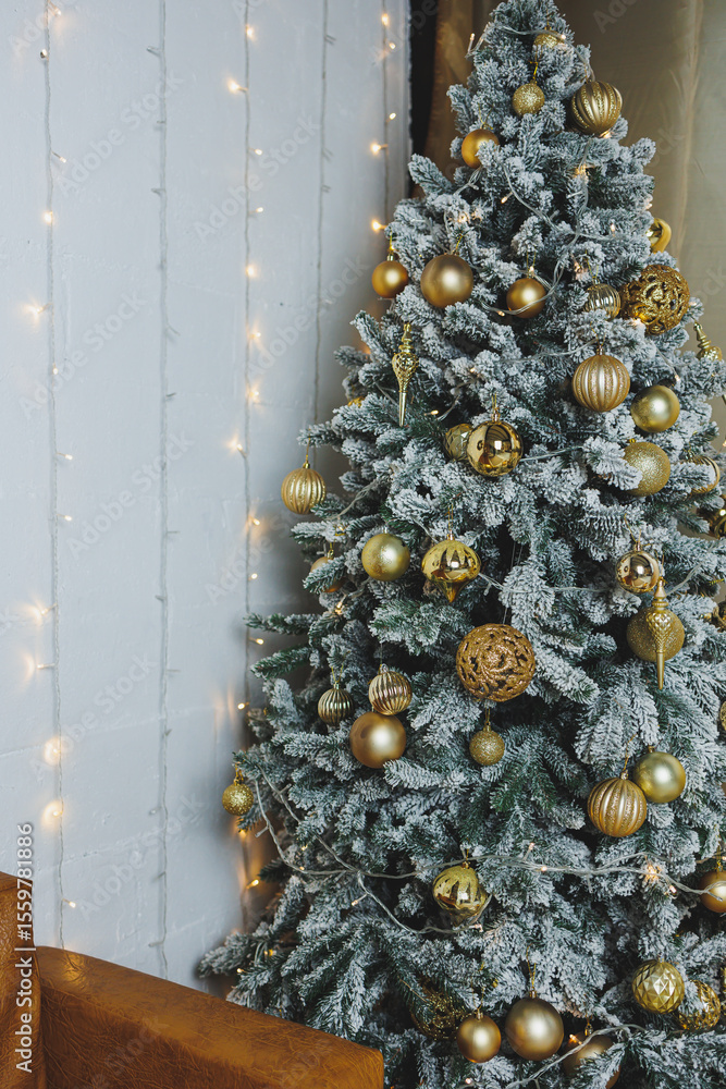 Experience a festive ambiance with a snowfrosted Christmas tree decorated with gold ornaments, creating a warm backdrop that enhances the spirit of celebration and togetherness this season