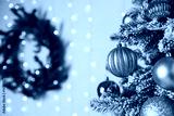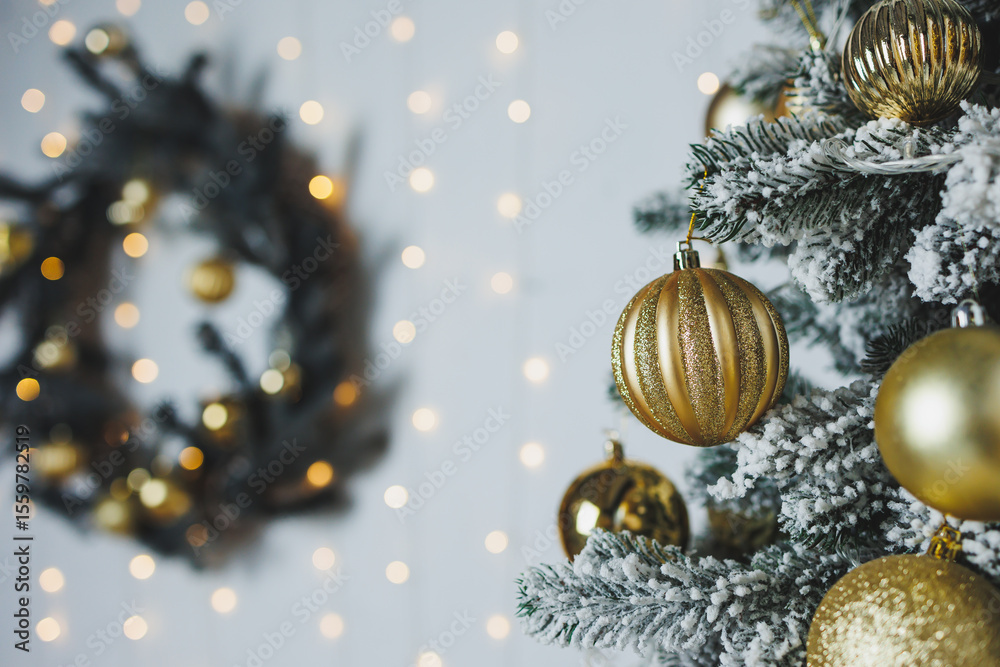 An Elegant Christmas Tree adorned with Golden Ornaments, complemented by a beautiful Festive Wreath in the background, creates a perfect holiday atmosphere that celebrates the joyous season