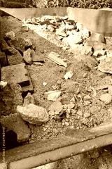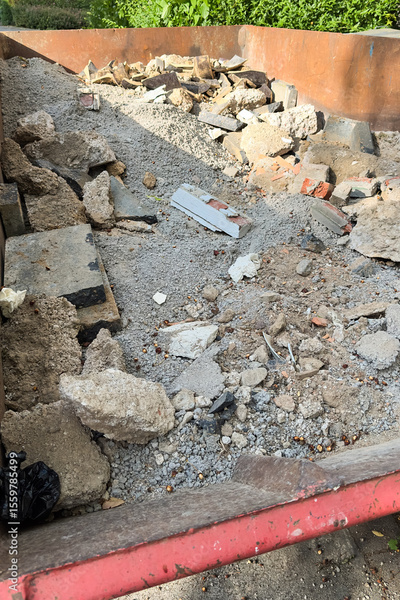 A detailed and closeup view of various types of construction debris found in a dumpster, showcasing the discarded materials that originate from recent renovation and construction projects