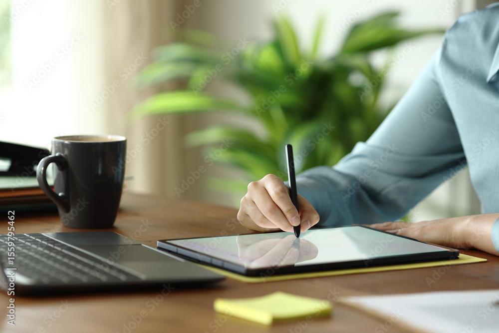 Office worker hands handwriting on tablet