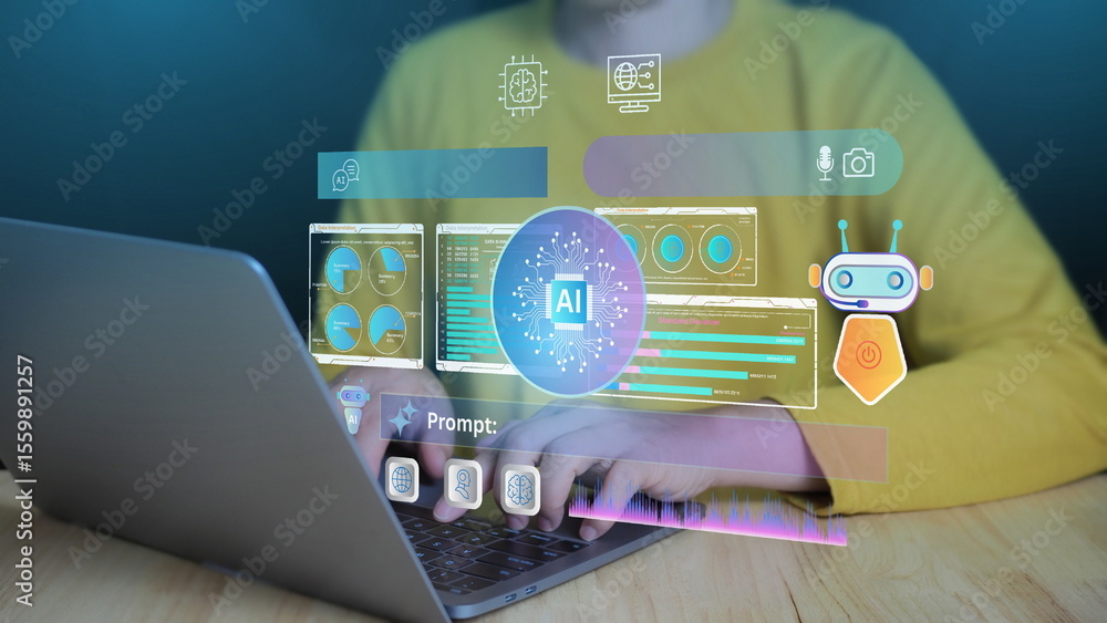 user interacts with an AI-powered dashboard on a laptop, illustrating how artificial intelligence supports data analysis, research, project planning, and task generation.
