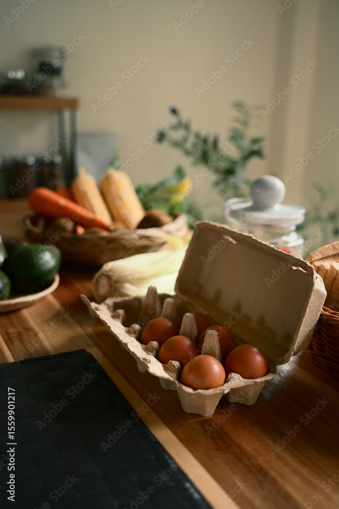 Fresh organic eggs in cardboard carton on a wooden kitchen counter surrounded by vegetables