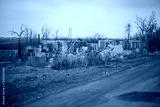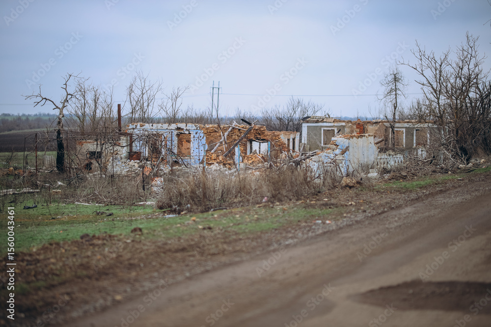 A completely destroyed house stands with only its frame and crumbling walls remaining, situated in a ruined village in Ukraine, located on recently de-occupied territory scarred by conflict and abando