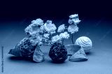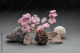 light pink roses and decorative wicker and bark objects on a graduated grey-black background, spectacular still life photography