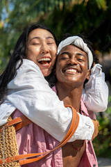Interracial couple enjoying a romantic beach getaway, embracing love, laughter, and togetherness