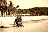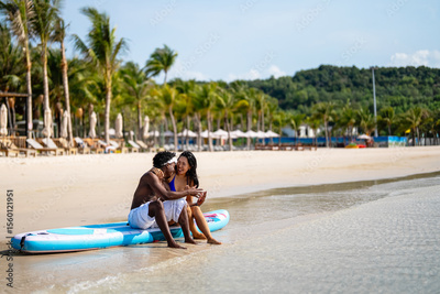 Carefree couple enjoying a tropical beach vacation, laughing making unforgettable memories together