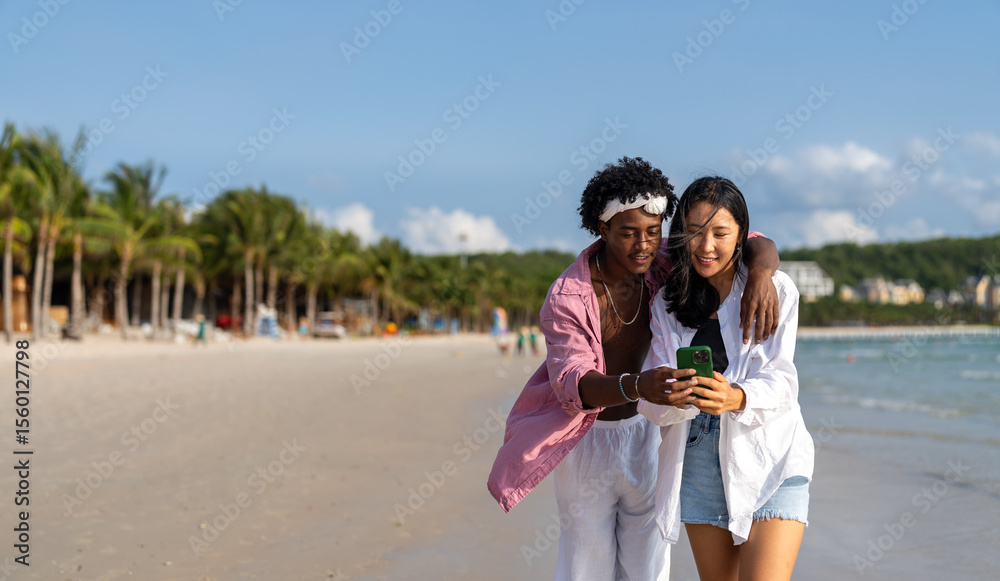 Happy interracial couple taking selfie at a tropical beach enjoying vacation, remote work
