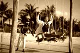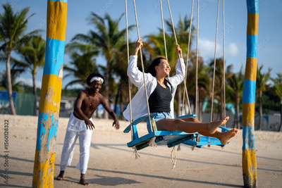 Passionate summer love on a tropical beach, young interracial couple enjoying adventure, laughter