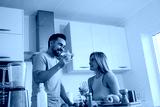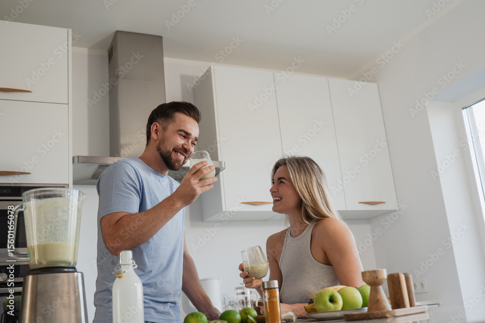 Couple Enjoying Homemade Smoothie Together in Modern Kitchen
