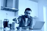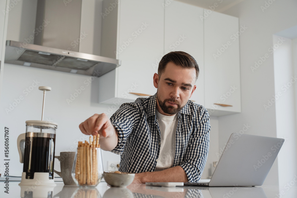 Man Working from Home with Coffee and Snacks in Modern Kitchen