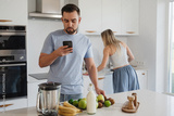 Couple Preparing Smoothie Together in Modern Kitchen Using Smartphone Recipe