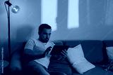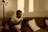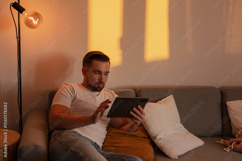 Man Browsing Tablet on Sofa During Cozy Evening at Home