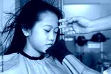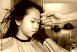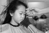 Asian girl having her hair straighten with a brush and a hair dryer. Hairdresser drying child hair.