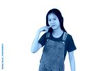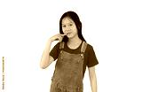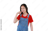 Cute Asian girl child keeping index finger on corner of mouth isolated over white background. Kid point at the part of body.