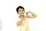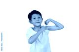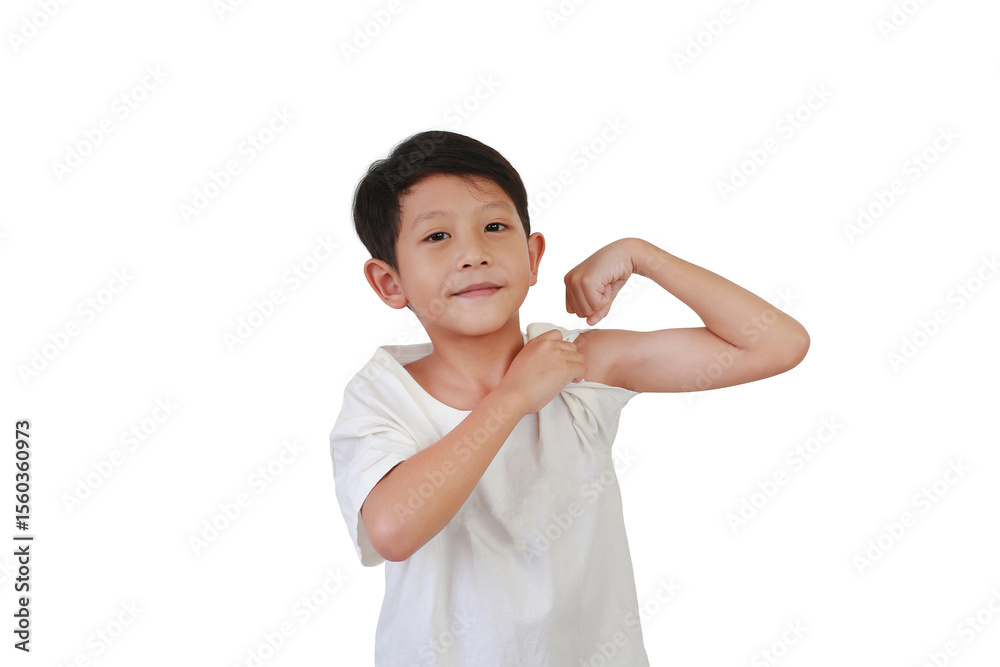 Portrait of smiling Asian boy child show muscles and biceps isolated on white background.