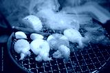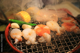 Squid, shrimp and vegetables grilling on grille, Fresh barbeque seafood in restaurant.