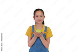 Portrait of Asian girl holding a fresh guava in hand and looking camera isolated on white studio background.