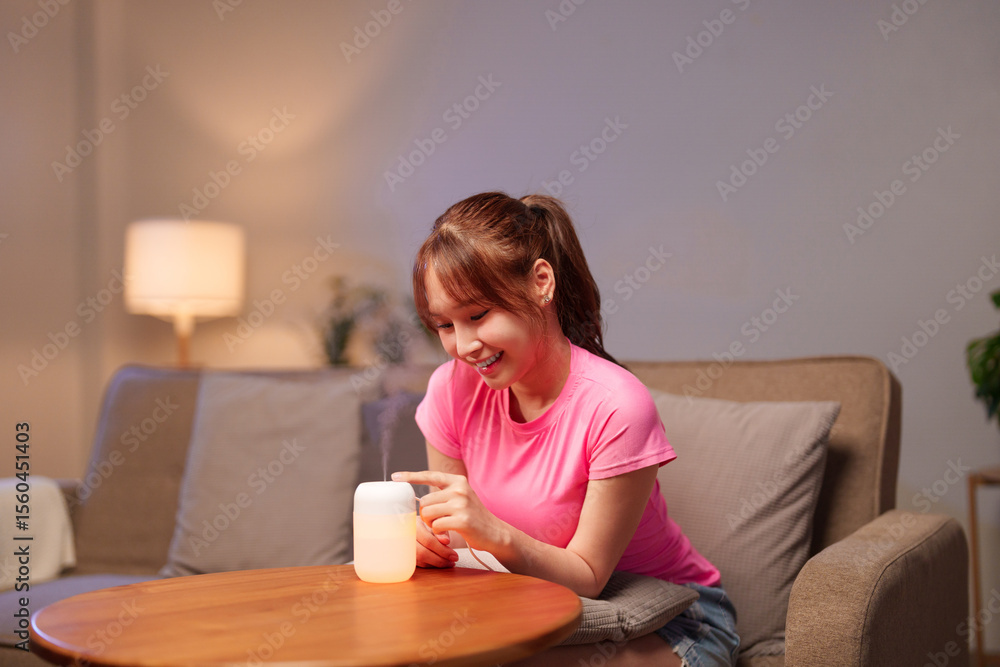 Asian Woman Using Aromatherapy Diffuser at Home for Relaxing Wellness Practices and Longevity Lifestyle Benefits with Natural Essential Oils
