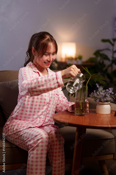 Asian Woman Watering Plants in Vase Home Garden Life Routine Indoor Plant Care Home Gardening for Relaxation Happy Hobby Longevity Lifestyle