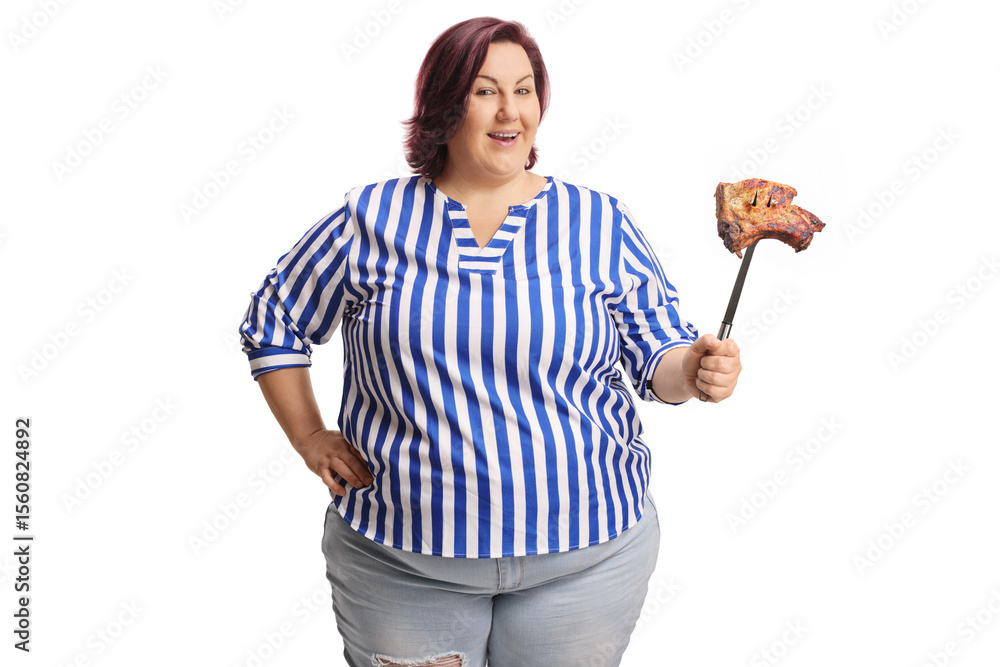 Corpulent woman holding a steak with a big fork