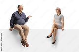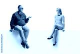 Young woman sitting on a panel and talking to a mature man