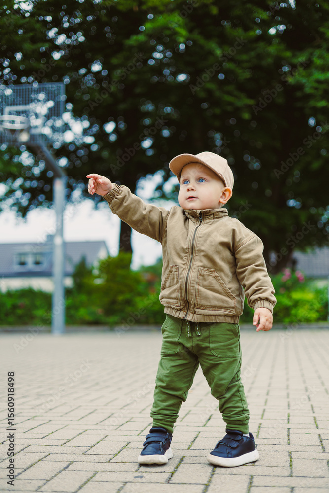 A curious little toddler dressed in trendy and casual outdoor attire joyfully points excitedly at something interesting in a lively park, radiating pure carefree spirit and the wonder of childhood