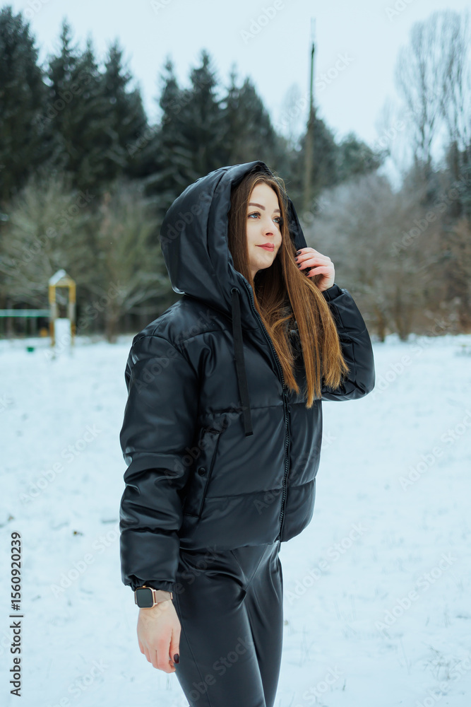 A Stylish Young Woman Embracing Winter Fashion Adorned in a Chic Elegant Black Puffer Jacket, She Stands Beautifully Against a Picturesque Snowy Landscape, Creating a Stunning Visual Experience