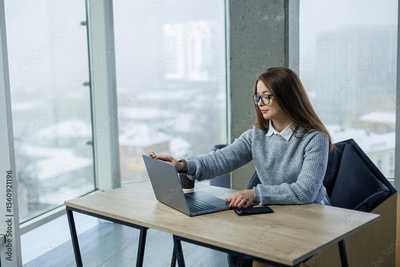 A young woman is working remotely from her modern and stylish workspace, which offers a stunning view of a snowy city outside, showcasing her dedication and productivity during the winter months