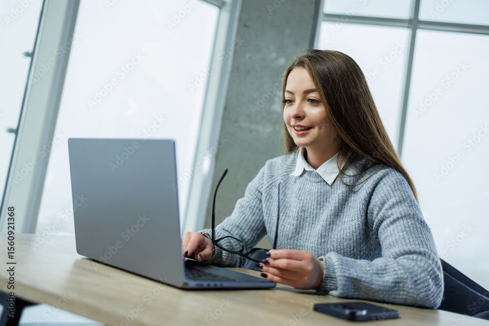 A Young Woman Actively Engaged in Remote Work Utilizing a Laptop Within a Contemporary Office Environment, Highlighting the Importance of Modern Workspaces in Todays Professional Landscape