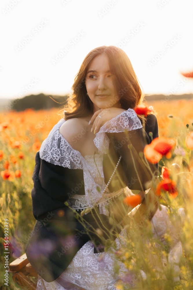 An Enchanting Sunset Portrait Capturing the Essence of a Young Woman Standing Gracefully in a Vibrant Flower Field Surrounded by Natures Beauty, Bathed in the Warm Glow of the Setting Sun