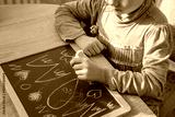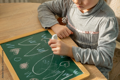 Preschool child draws letters, hearts, develops handwriting, fine motor skills, learning, early education, blackboard using, Early childhood development