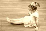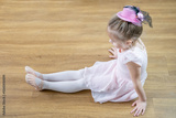 Cute 5-year-old ballerina girl holding tired legs. Ballet practice. Dance and art, dance injury, pointe shoes, discipline of ballet
